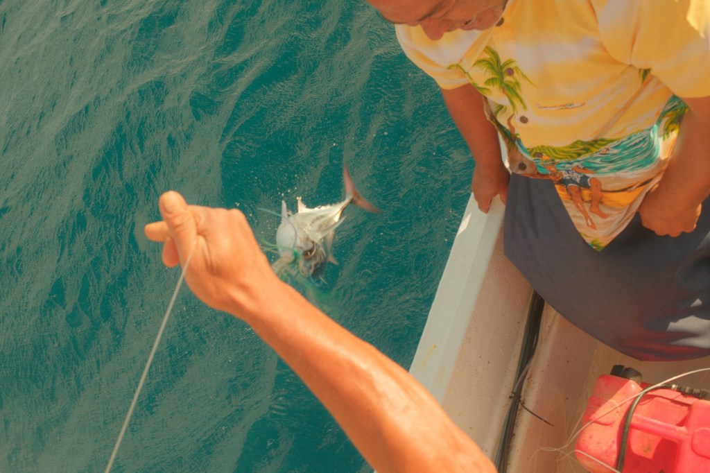 The boat we were on was a silly little boat with an awful lot of large Tongan men and one skinny American. It was very full so I was told to sit in the front. The front kept splashing me so I decided to lie on the roof. It was beautiful up there, a very special moment. I thought to myself, I pressed the “send me where I’m needed most” button when I applied to be in the Peace Corps. I was lucky enough to get selected for Tonga, I was lucky enough to get accepted, I was lucky enough to be placed in Vava’u, and now, after all the domino luck, I was lying on my back, on top of a boat in the middle of the ocean, watching the clouds float by. Around this time the men managed to catch a fish (while the boat was going) and they all started yelling, “Ota ika!” (raw fish). They chopped it up and immediately started eating it.